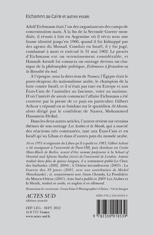 À l'époque, sous la direction de Nasser, l'Égypte était le porte-drapeau du nationalisme arabe, le champion de la lutte contre Israël, et il n'était pas rare en Europe et aux États-Unis de l'assimiler au fascisme, voire au nazisme. D'où l'intérêt de savoir comment l'affaire Eichmann a été couverte par la presse de ce pays en particulier. Gilbert Achcar y répond en se fondant sur le quotidien «Al-Ahram», alors dirigé par le confident de Nasser, Mohammed Hassanein Heikal.