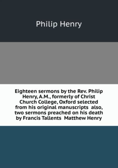 Eighteen sermons by the Rev. Philip Henry, A. M., formerly of Christ Church College, Oxford selected from his original manuscripts also, two sermons preached on his death by Francis Tallents Matthew Henry This book, "Eighteen sermons by the Rev. Philip Henry, A. M., formerly of Christ Church College, Oxford selected from his original manuscripts also, two sermons preached on his death by Francis Tallents Matthew Henry", by Philip Henry, is a replication of a book originally published before 1816. It has been restored by human beings, page by page, so that you may enjoy it in a form as close to the original as possible. This book was created using print-on-demand technology. Thank you for supporting classic literature.