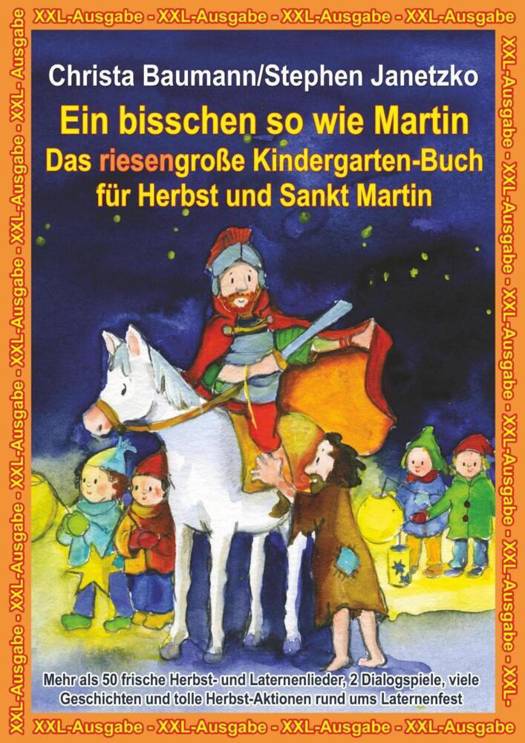 Ein bisschen so wie Martin - Das riesengroße Kindergarten-Buch für Herbst und Sankt Martin - die XXL-Ausgabe des Buchs mit 40 Seiten größerem Gesamtumfang, 25 zusätzlichen Liedern und noch mehr Aktionen inkl. "Das Spiel vom Teilen"! Mehr als 50 frische Herbst- und Laternenlieder, 2 Dialogspiele, viele Geschichten und tolle Herbst-Aktionen rund ums Laternenfest.Der Höhepunkt des Herbstes ist für Kinder der Martinsumzug. Die Tage sind inzwischen kürzer geworden und schon früh macht sich die Dämmerung breit. Im Garten liegen bunte Herbstblätter, der Wind bläst und nimmt den Drachen mit in die Luft. Jetzt ist die Zeit gekommen, es sich im warmen Zimmer gemütlich zu machen, mit einem Tee und bei Kerzenlicht den Geschichten von St. Martin zu lauschen und Laternenlieder zu singen. Es werden Laternen gebastelt, Rollenspiele probiert und es wird gebacken.In diesem Buch finden Sie mehr als 50 neue und einige bekannte Laternenlieder und Herbstlieder, darunter alle Lieder der separat erhältlichen CDs "Ein bisschen so wie Martin" und "Ich geh mit meiner Laterne, Laterne" von Stephen Janetzko.Dazu gibt es Geschichten rund ums Teilen, um die Laternen- und Herbstzeit von Elke Bräunling sowie zwei Dialogspiele.Außerdem zur ganzheitlichen Förderung:- Aktionen in der Einrichtung zum Teilen- verschiedene Versuche- viele Techniken zum Laternenbasteln und andere Kreativideen- Bewegungs- und Darstellungsspiele- Rezepte, Rätsel und Scherzfragen- Bastelideen rund um St. Martin und den Herbst- ein Tischtheater und eine Pantomime mit Orchesterbegleitung- 2 Dialogspiele fürs Laternenfest- Tipps für den Laternenumzug und für den Umgang mit einem Pferd beim Martinsspiel- und ein Memory zum Ausmalen... und vieles mehr in dieser extra-großen XXL-Ausgabe!Lassen Sie sich überraschen!
