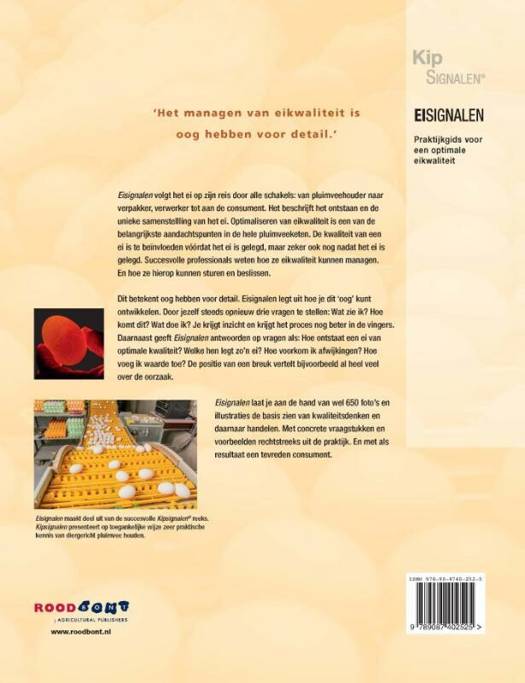 Dit betekent oog hebben voor detail. Eisignalen legt uit hoe je dit 'oog' kunt ontwikkelen. Door jezelf steeds opnieuw drie vragen te stellen: Wat zie ik? Hoe komt dit? Wat doe ik? Je krijgt inzicht en krijgt het proces nog beter in de vingers. Daarnaast geeft Eisignalen antwoorden op vragen als: Hoe ontstaat een ei van optimale kwaliteit? Welke hen legt zo'n ei? Hoe voorkom ik afwijkingen? Hoe voeg ik waarde toe? De positie van een breuk vertelt bijvoorbeeld al heel veel over de oorzaak.