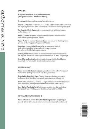 El espacio provincial en la península ibérica (Antigüedad tardía - Alta Edad Media) En el origen de este monográfico se halla la voluntad de unos historiadores de la Antigüedad de cuestionar la validez del mapa, propuesto por E. Albertini en 1923, de la trama provincial que siguió a la reforma de Diocleciano en Hispania. Para trazarlo, E. Albertini utilizó el «principio de acomodación» que habría permitido la preservación de las estructuras territoriales romanas, en las de la Iglesia en la Alta Edad Media. Para abordar esta cuestión, se hizo necesario el diálogo con historiadores medievales. Este diálogo que abarca los siglos entre el IV y el XII ha tenido el mérito de superar la cuestión inicial para adoptar el enfoque epistemológico más fértil del «spatial turn» en el que las provincias ya no se pueden considerar únicamente como meros territorios congelados, sino como espacios marcados por la discontinuidad y la plasticidad de su uso.