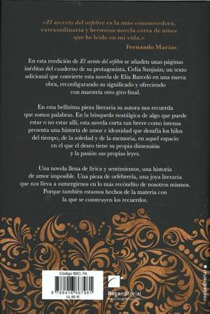 «El secreto del orfebre es la más conmovedora, extraordinaria y hermosa novela corta de amor que he leído en mi vida.» Fernando MaríasEn esta reedición de El secreto del orfebre se añaden unas páginas inéditas del cuaderno de su protagonista, Celia Sanjuán; un texto adicional que convierte a esta novela de Elia Barceló en una nueva obra, reconfigurando su significado y ofreciendo con maestría otro giro final.En esta bellísima pieza literaria su autora nos recuerda que somos palabras, que somos seres que nos narramos a nosotros mismos, creando así nuestra propia historia. En la búsqueda nostálgica de algo que puede estar o no estar allí, esta novela corta tan breve como intensa presenta una historia de amor e identidad que desafía los hilos del tiempo, de la soledad y de la memoria, en aquel espacio en el que el deseo tiene su propia dimensión y la pasión sus propias leyes.Una novela llena de lírica y sentimientos, una historia de amor imposible. Una pieza de orfebrería, una joya literaria que nos lleva a sumergirnos en lo más recóndito de nosotros mismos. Porque también estamos hechos de la materia con la que se construyen los recuerdos.«El título alude a la pericia de fabricar con cosas pequeñas objetos preciosos. Eso es lo que Elia Barceló ha conseguido: crear una pequeña joya.» José Luis Charcán, La Razón«Una pequeña novela, mezcla de cuento y fábula, absolutamente maravillosa, empapada de dulzura y ternura, con un lado fantástico que le aporta una dimensión suplementaria, donde todos los sueños son posibles.» Le club des rats de Biblionet, Francia«Un extraordinario placer de lectura.» Gregor Schuhen, Frankfurter Allgemeine Zeitung«Una incomparable joya literaria. Un libro de una intensidad sin parangón sobre el amor y la eterna rueda del destino.» Westdeutsche Zeitung«Fascin ante y evocadora como un álbum de fotografías antiguas.» DN Kultur, Suecia