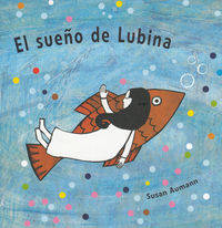 Lubina duerme y sueña, sueña en su cama, sueña en el trabajo, sueña con el agua, sueña con ser como un pez, sueña que tiene un vestido de escamas y peces en el estómago. ¡Riiiing! Lubina abre la puerta y entra su vecino. Trae un pez y viste un jersey de escamas. Se llama señor Rodaballo.