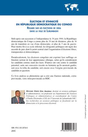 Sitôt après son accession à l'indépendance le 30 juin 1960, la République démocratique du Congo a connu plus de 30 ans de dictature, plus de 16 ans de transition en vue d'une démocratie, et plus de 5 ans de guerre. Pour mettre fin à ce cycle infernal, les dirigeants politiques ont signé des accords de paix dont le point central était l'organisation d'élections libres, transparentes et démocratiques. Paradoxalement, les électeurs congolais ont exprimé leur suffrage en fonction surtout de leur appartenance ethnique, selon qu'ils considéraient les candidats comme étant des leurs. Ce livre analyse ce phénomène qui a créé une fracture nationale, extra provinciale, voire intra-provinciale en RDC.