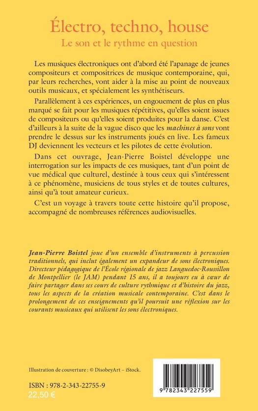 Les musiques électroniques ont d'abord été l'apanage de jeunes compositeurs et compositrices de musique contemporaine, qui vont aider à la mise au point de nouveaux outils musicaux, spécialement les synthétiseurs. Parallèlement, un engouement de plus en plus marqué se fait pour les musiques répétitives. C'est d'ailleurs à la suite de la vague disco que les machines à sons vont prendre le dessus sur les instruments joués en live. Les fameux DJ deviennent les vecteurs et les pilotes de cette évolution. Jean-Pierre Boistel développe une interrogation sur les impacts de ces musiques, tant d'un point de vue médical que culturel, destinée à tous ceux qui s'intéressent à ce phénomène, musiciens de tous styles et de toutes cultures, ainsi qu'à tout amateur curieux. C'est un voyage à travers toute cette histoire qu'il propose, accompagné de nombreuses références audiovisuelles.