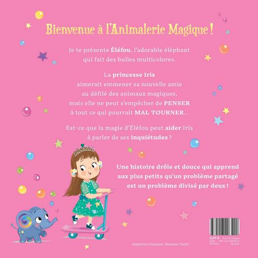 Bienvenue à l'Animalerie Magique ! Je te présente Eléfou, l'adorable éléphant qui fait des bulles multicolores. La princesse Iris aimerait emmener sa nouvelle amie au défilé des animaux magiques, mais elle ne peut s'empêcher de penser à tout ce qui pourrait mal tourner... Est-ce que la magie d'Elefou peut aider Iris à parler de ses inquiétudes ? Une histoire drôle et douce qui apprend aux plus petits qu'un problème partagé est un problème divisé par deux !