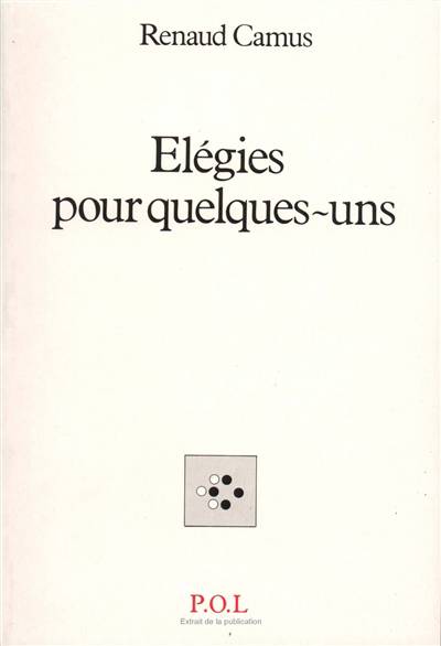 Les neuf textes qui composent ce petit livre ont été rédigés sur presque une dizaine d'années, à des moments perdus, pourrait-on dire, du moins pour les premiers. Le vide, le regret, le silence et le temps qui passe ont eu tout loisir, dès lors, de s'immiscer entre eux, parmi leurs paragraphes, dans la matière même de leurs phrases, peut-être, et la couleur de leurs mots ; c'est au point que ces proses ne trouvent leur résolution, sur le tard, qu'autour de ce thème, l'absence, dont on dirait qu'elles s'efforcent de constituer, distraitement, une sorte de bref traité, mélancolique, ardent et souriant. Les Élégies pour quelques-uns sont le livre compagnon de Tricks, sa contre-épreuve, si l'on veut : mince puisque Tricks est épais, discursif puisqu'il ne commente pas, lyrique puisqu'il est impassible, sentimental puisqu'il ne parle que des corps et des gestes.