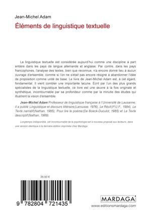 La linguistique textuelle est considérée aujourd'hui comme une discipline à part entière dans les pays de langue allemande et anglaise. Par contre, dans les pays francophones, l'analyse des textes, bien que reconnue, n'a encore donné lieu à aucun ouvrage d'ensemble, comme si l'on ne s'était pas encore résigné à abandonner l'idée de proposition comme unité de base. Le livre de Jean-Michel Adam est, à cet égard, fondamental. Il vient combler une importante lacune. Écrit par l'un des plus grands spécialistes de la linguistique textuelle, ce livre est une oeuvre à la fois originale et synthétique, incontournable par sa profondeur comme par la minutie des études qui illustrent la vision d'ensemble. Jean-Michel Adam Professeur de linguistique française à l'Université de Lausanne, il a publié Linguistique et discours littéraire(Larousse, 1976), Le Récit(P.U.F., 1984), Le Texte narratif(Nathan, 1985), Pour lire le poème(De Boeck-Duculot, 1985) et Le Texte descriptif(Nathan, 1989).