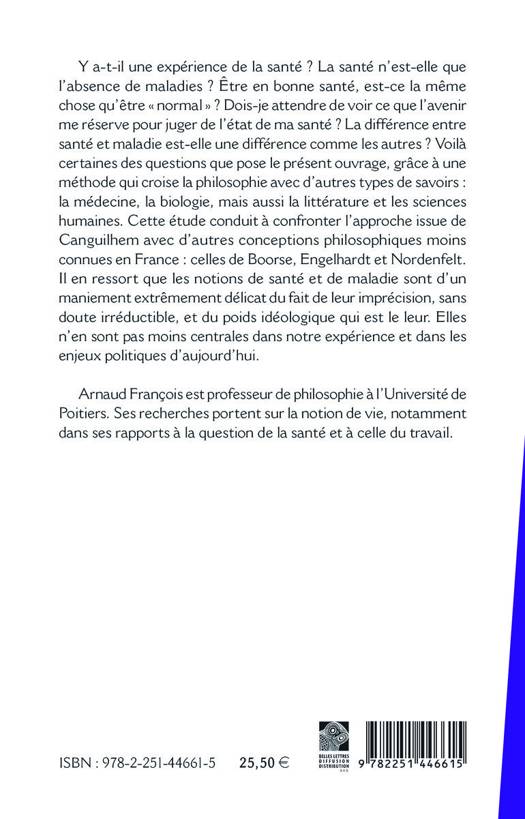 Y a-t-il une experience de la sante ? La sante n'est-elle que l'absence de maladies ? Etre en bonne sante, est-ce la meme chose qu'etre normal ? Dois-je attendre de voir ce que l'avenir me reserve pour juger de l'etat de ma sante ? La difference entre sante et maladie est-elle une difference comme les autres ? Voila certaines des questions que pose le present ouvrage, grace a une methode qui croise la philosophie avec d'autres types de savoirs: la medecine, la biologie, mais aussi la litterature et les sciences humaines. Cette etude conduit a confronter l'approche issue de Canguilhem avec d'autres conceptions philosophiques moins connues en France: celles de Boorse, Engelhardt et Nordenfelt. Il en ressort que les notions de sante et de maladie sont d'un maniement extremement delicat du fait de leur imprecision, sans doute irreductible, et du poids ideologique qui est le leur. Elles n'en sont pas moins centrales dans notre experience et dans les enjeux politiques d'aujourd'hui.