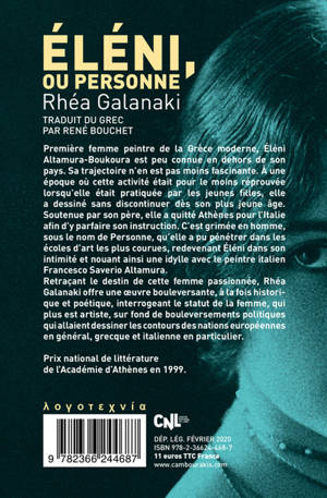 Réédition du dernier grand roman de Rhéa Galanaki, certainement l'un de ses plus importants. Elle y suit la trajectoire d'Eléni Alta mura-Boukouna, la première femme peintre grecque qui, au XIXe siècle, est allée étudier en Italie. La fréquentation des écoles étant alors interdite aux femmes, Eléni se grimait en homme pendant la journée, afin de pouvoir suivre les cours, dessiner des nus et obtenir un diplôme. Son déguisement l'a aussi contrainte à se créer une autre identité, sous le nom de Personne, un double auquel elle renonçait le soir, revêtant ses vêtements de femme, mais qui la hantera tout au long de son existence. En tant qu'Eléni, elle s'est éprise d'un peintre italien renommé qui l'a forcée à se convertir au catholicisme pour l'épouser avant de l'abandonner avec leurs deux enfan