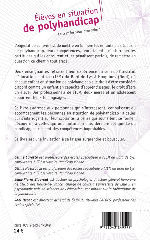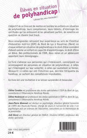 L’objectif de ce livre est de mettre en lumière les enfants en situation de polyhandicap, leurs compétences, leurs talents, d’interroger les certitudes qui les entourent et les pénalisent parfois, de remettre en question ce chemin tout tracé. Deux enseignantes retracent leur expérience au sein de l’Institut d’éducation motrice (IEM) du Bord de Lys à Houplines (Nord) où chaque enfant en situation de polyhandicap a le droit d’être considéré d’abord comme un enfant en capacité d’apprentissages, le droit d’être un élève. Des professionnels de l’IEM, deux mères et un adolescent apportent leurs témoignages.