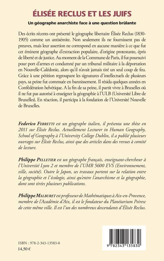 Des écrits récents ont présenté le géographe libertaire Elisée Reclus (1830-1905) comme un antisémite. Comment peut-on affirmer un tel propos compte tenu de la nature du personnage et de ses convictions politiques ? Comment Reclus perçoit-il géographiquement le statut territorial particulier qui caractérise les Juifs ? Quelles sont les implications politiques de sa vision dans le contexte de la pensée socialiste et anarchiste d'alors ?