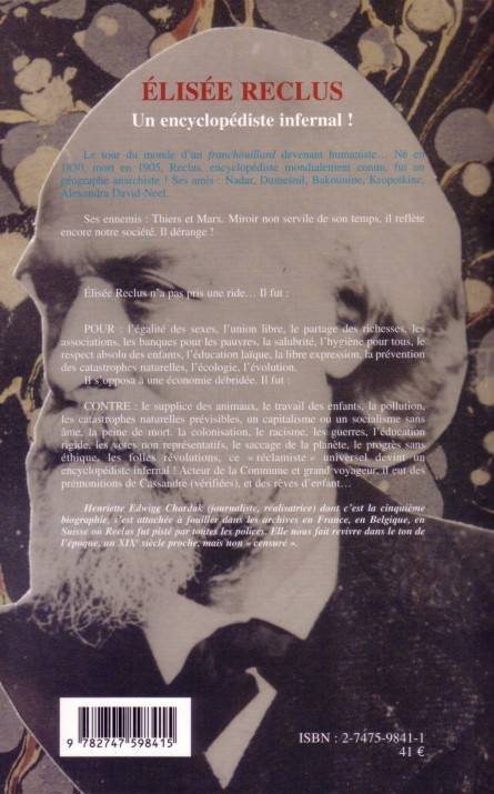 Né en 1830, mort en 1905, Reclus, encyclopédiste mondialement connu, fut un géographe anarchiste. Ses amis : Nadar, Dumesnil, Bakounine, Kropotkine, Alexandra David-Neel. Ses ennemis : Thiers et Marx. Miroir non servile de son temps, il reflète encore notre société. Il fut pour l'égalité des sexes, l'union libre, le partage des richesses, les banques pour les pauvres, l'hygiène pour tous, l'éducation laïque, la libre expression, l'écologie, l'évolution... Il fut contre le supplice des animaux, le travail des enfants, un capitalisme ou en socialisme sans âme, la peine de mort, la colonisation, le racisme, les guerres...