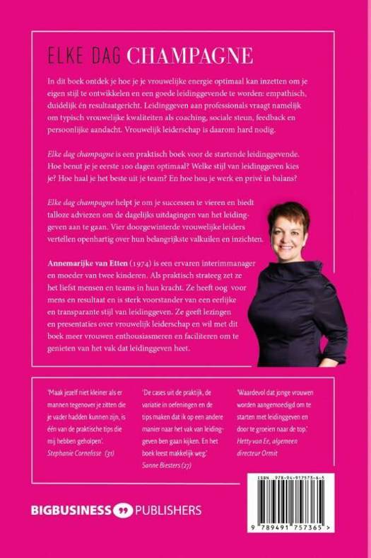 In dit boek ontdek je hoe je je vrouwelijke energie optimaal kan inzetten om je eigen stijl te ontwikkelen en een goede leidinggevende te worden: empathisch, duidelijk én resultaatgericht. Leidinggeven aan professionals vraagt namelijk om typisch vrouwelijke kwaliteiten als coaching, sociale steun, feedback en persoonlijke aandacht. Vrouwelijk leiderschap is daarom hard nodig. Elke dag champagne is een praktisch boek voor de startende leidinggevende. Hoe benut je je eerste 100 dagen optimaal? Welke stijl van leidinggeven kies je? Hoe haal je het beste uit je team? En hoe hou je werk en privé in balans? Elke dag champagne helpt je om je successen te vieren en biedt talloze adviezen om de dagelijks uitdagingen van het leidinggeven aan te gaan. Vier doorgewinterde vrouwelijke leiders vertellen openhartig over hun belangrijkste valkuilen en inzichten.
