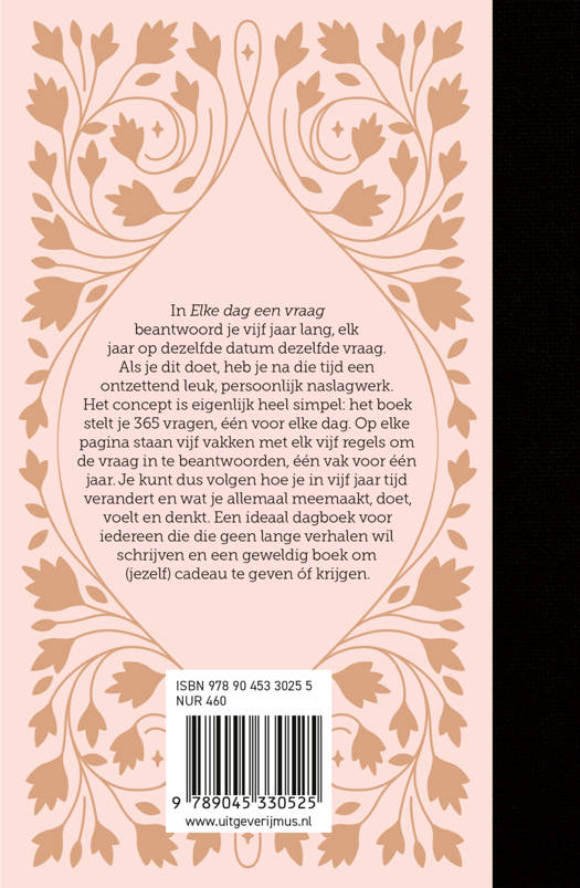 In 'Elke dag een vraag' beantwoord je vijf jaar lang, elk jaar op dezelfde datum dezelfde vraag. Als je dit doet, heb je na die tijd een ontzettend leuk, persoonlijk naslagwerk. Het concept is eigenlijk heel simpel: het boek stelt je 365 vragen, één voor elke dag. Op elke pagina staan vijf vakken met elk vijf regels om de vraag in te beantwoorden, één vak voor één jaar. Je kunt dus volgen hoe je in vijf jaar tijd verandert en wat je allemaal meemaakt, doet, voelt en denkt. Een ideaal dagboek voor iedereen die geen lange verhalen wil schrijven en een geweldig boek om (jezelf) cadeau te geven óf krijgen.