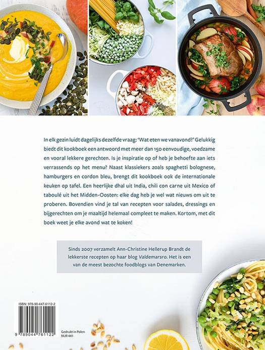In elk gezin luidt dagelijks dezelfde vraag: 'Wat eten we vanavond?' Gelukkig biedt dit kookboek een antwoord met meer dan 150 eenvoudige, voedzame en vooral lekkere gerechten. Is je inspiratie op of heb je behoefte aan iets verrassends op het menu? Naast klassiekers zoals spaghetti bolognese, hamburgers en cordon bleu, brengt dit kookboek ook de internationale keuken op tafel. Een heerlijke dhal uit India, chili con carne uit Mexico of taboulé uit het Midden-Oosten: elke dag heb je wel wat nieuws om uit te proberen. Bovendien vind je tal van recepten voor salades, dressings en bijgerechten om je maaltijd helemaal compleet te maken. Kortom, met dit boek weet je elke avond wat te koken! Sinds 2007 verzamelt Ann-Christine Hellerup Brandt de lekkerste recepten op haar blog Valdemarsro. Het is een van de meest bezochte foodblogs van Denemarken.