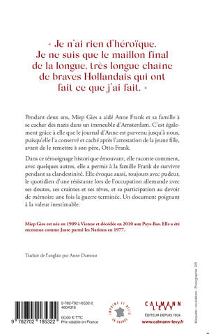 Dans ce témoignage historique émouvant, elle raconte comment, avec quelques autres, elle a permis à la famille Frank de survivre pendant sa clandestinité. Elle évoque aussi, toujours avec pudeur, le quotidien d’une résistante lors de l’occupation allemande avec ses doutes, ses craintes et ses rêves, et sa participation au devoir de mémoire une fois la guerre terminée. Un document poignant à la valeur inestimable.