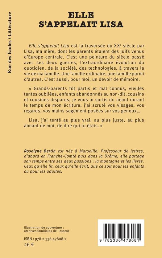 Elle s'appelait Lisa est la traversée du XXe siècle par Lisa, ma mère, dont les parents étaient des Juifs venus d'Europe centrale. C'est une peinture du siècle passé avec ses deux guerres, l'extraordinaire évolution du quotidien, de la société, des technologies, à travers la vie de ma famille. Une famille ordinaire, une famille parmi d'autres. C'est aussi, pour moi, un devoir de mémoire. Grands-parents tôt partis et mal connus, vieilles tantes oubliées, enfants abandonnés au non-dit, cousins et cousines disparus, je vous ai sortis du néant durant le temps de mon écriture, j'ai scruté vos visages, vos regards, vos mains sagement posées sur vos genoux... Lisa, j'ai tenté au plus vrai, au plus juste, au plus aimant de moi, de dire qui tu étais.