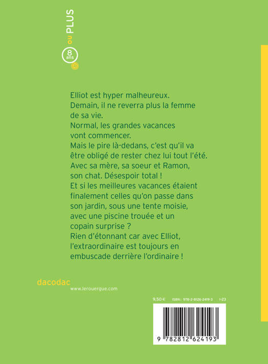 Elliot est hyper malheureux. Demain, c'est les grandes vacances... et il ne verra plus la femme de sa vie, Lisa, de tout l'été. Désespoir total ! Heureusement, le programme est plein de promesses dépaysantes : piscine gonflable dans le jardin (idéale pour apprendre le surf), camping dans le jardin et même un nouvel ami, Léo, rencontré... dans le jardin ! Et si ces vacances avaient un sens caché, une leçon de vie, un message philosophique à lui délivrer ? Rien d'étonnant car avec Elliot, l'extraordinaire est toujours en embuscade derrière l'ordinaire !