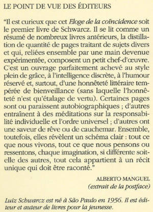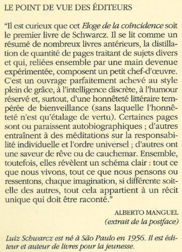 Sur une trame apparemment simple, l'auteur compose dans ce recueil un panorama de rêveurs ordinaires. Pas ou peu d'action autre que l'imagination, le détail du souvenir qui enclenche la merveilleuse machine à fiction pour raconter une histoire. Quelques-unes sont fortement inspirées de personnages réels, d'autres incontestablement autobiographiques et toutes sont écrites avec élégance, justesse et subtilité. Luiz Schwarz sait saisir ce moment de grâce douloureuse où doucement l'on s'élance dans le rêve, on observe à distance, et on reste suspendu comme si jamais plus on n'allait toucher terre. Plaisir de rêves qui ne seront jamais réalisés.