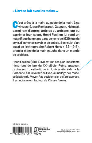 C'est grâce à la main, au geste de la main, à sa virtuosité, que Rembrandt, Gauguin, Hokusai, parmi tant d'autres, artistes ou artisans, ont pu exprimer leur talent. Henri Focillon lui rend un magnifique hommage dans ce texte de 1939 tout de style, d'immense savoir et de poésie. Il est suivi d'un essai de l'ethnographe Robert Hertz (1881-1915), premier éloge de la main gauche dans un monde de droitiers.