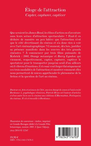 L'attraction n'est-elle que le côté divertissant du cinéma ? Comment, dès lors, justifier sa présence manifeste dans les oeuvres des très grands cinéastes ? À commencer par trois films puissants de Kubrick : "2001", "Orange mécanique" et "Barry Lyndon" qui viennent respectivement, capter, capturer, captiver le spectateur pour le transporter jusqu'au seuil d'un ailleurs où il vibrera d'émotions. Cet essai veut forger théoriquement ces trois modalités de l'attraction et montrer comment elles nous permettent de mieux appréhender le phénomène de la fiction et la question de l'art au cinéma.