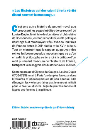 C'est une autre histoire du pouvoir royal que proposent les pages inédites de ce bref recueil où Louise Dupin, féministe des Lumières et châtelaine de Chenonceau, entend réhabiliter le rôle politique des vingt-huit reines ayant vécu avec dix-huit rois de France entre le XIIe siècle et le XVIIe siècle. Tout en montrant que le rapport au pouvoir des reines fut beaucoup plus important que ce qu'on en a dit, la philosophe se livre ici à la critique d'un récit purement masculin de l'histoire de France, fustigeant la misogynie des historiens eux-mêmes.