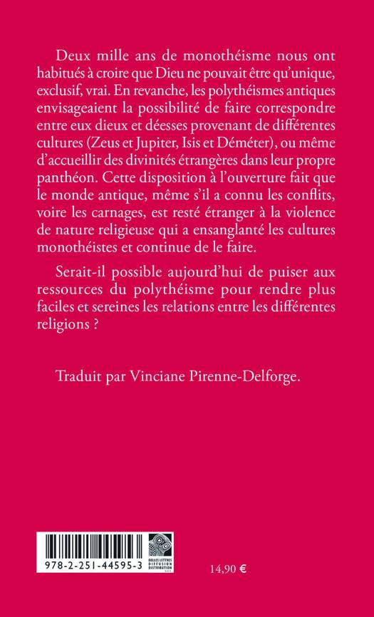 Deux mille ans de monotheisme nous ont habitues a croire que Dieu ne pouvait etre qu'unique, exclusif, vrai. En revanche, les polytheismes antiques envisageaient la possibilite de faire correspondre entre eux dieux et deesses provenant de differentes cultures (Zeus et Jupiter, Isis et Demeter), ou meme d'accueillir des divinites etrangeres dans leur propre pantheon. Cette disposition a l'ouverture fait que le monde antique, meme s'il a connu les conflits, voire les carnages, est reste etranger a la violence de nature religieuse qui a ensanglante les cultures monotheistes et continue de le faire.Serait-il possible aujourd'hui de puiser aux ressources du polytheisme pour rendre plus faciles et sereines les relations entre les differentes religions ?