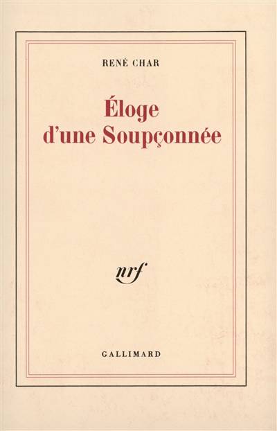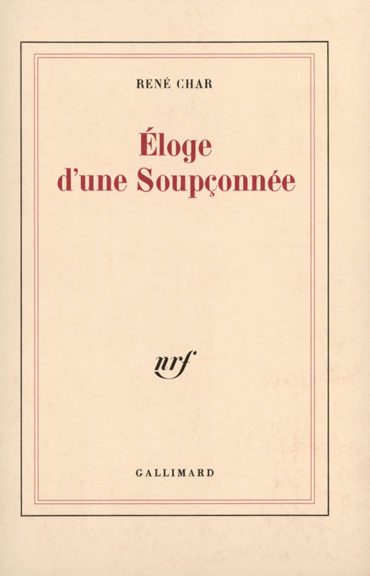 "Soupçonnons que la poésie soit une situation entre les alliages de la vie, l'approche de la douleur, l'élection exhortée, et le baisement en ce moment même. Elle ne se séparerait de son vrai coeur que si le plein découvrait sa fatalité, le combat commencerait alors entre le vide et la communion. Dans ce monde transposé, il nous resterait à faire le court éloge d'une Soupçonnée, la seule qui garde force de mots jusqu'au bord des larmes. Sa jeune démence aux douze distances croyant enrichir ses lendemains s'illusionnerait sur la moins frêle aventure despotique qu'un vivant ait vécu en côtoyant les chaos qui passaient pour irrésistibles. Ils ne l'étaient qu'intrinsèquement mais sans une trace de caprice. Venus d'où ? D'un calendrier bouleversé bien qu'uni au Temps, sans qu'en soit ressentie l'usure. Verdeur d'une Soupçonnée..." René Char.