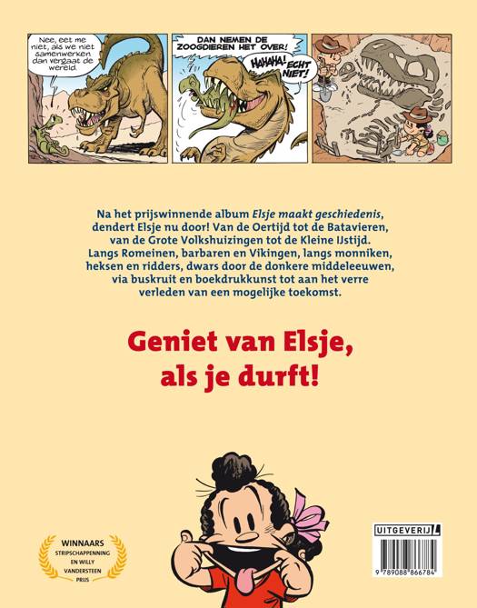 Na het prijswinnende album “Elsje maakt geschiedenis”, dendert Elsje nu door! Van de Oertijd tot de Batavieren, van de Grote Volkshuizingen tot de Kleine IJstijd. Langs Romeinen, barbaren en Vikingen, langs monniken, heksen en ridders, dwars door de donkere middeleeuwen, via buskruit en boekdrukkunst tot aan het verre verleden van een mogelijke toekomst.
