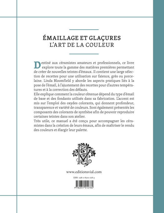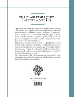 Destiné aux céramistes amateurs et professionnels, ce livre explore toute la gamme des matières premières permettant de créer de nouvelles teintes d’émaux. Il contient une large sélection de recettes pour une utilisation sur faïence, grès ou porcelaine. Linda Bloomfield y aborde les aspects pratiques liés à la pose de l’émail, à l’ajustement des recettes pour d’autres températures et à la correction des défauts. Elle explique comment la couleur obtenue dépend du type d’émail de base et des fondants utilisés dans sa fabrication. L’accent est mis sur l’emploi des oxydes colorants, qui donnent profondeur, transparence et variété de couleurs. Sont également présentés les composants des colorants de synthèse afin de pouvoir reproduire certaines teintes dans son atelier. Très utile, ce manuel a été conçu pour accompagner les céramistes dans la création de leurs émaux, afin de maîtriser le rendu des couleurs et élargir leur palette.