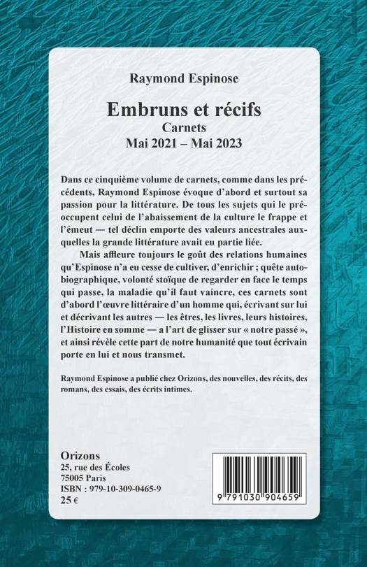 Dans ce cinquième volume de carnets, comme dans les précédents, Raymond Espinose évoque d'abord et surtout sa passion pour la littérature. De tous les sujets qui le préoccupent celui de l'abaissement de la culture le frappe et l'émeut ― tel déclin emporte des valeurs ancestrales auxquelles la grande littérature avait eu partie liée. Mais affleure toujours le goût des relations humaines que notre écrivain n'a eu cesse de cultiver, d'enrichir; quête autobiographique, volonté stoïque de regarder en face le temps qui passe, la maladie qu'il faut vaincre, ces carnets sont d'abord l'oeuvre littéraire d'un homme qui, écrivant sur lui et décrivant les autres ― les êtres, les livres, leurs histoires, l'Histoire en somme ― a l'art de glisser sur notre passé et ainsi révèle cette part de notre humanité que tout créateur porte en lui et nous transmet.