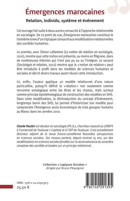 Cet ouvrage fait suite à deux autres consacrés à l'approche relationnelle en sociologie. De ce point de vue, Émergences marocaines constitue le troisième tome d'un triptyque consacré aux modélisations relationnelles des sociétés humaines. Dans l'ouvrage présent, l'auteur applique un modèle relationnel d'une nature particulière, puisqu'il définit la « relation » non seulement comme rencontre ontologique entre les êtres et les choses, mais surtout comme principe épistémologique de construction des modèles en SHS. Dans cette modélisation, la réintroduction du concept d'événement, longtemps banni des SHS, lui permet d'historiciser son modèle pour comprendre l'émergence socio-économique de trois groupes humains au Maroc dans les années 2010.