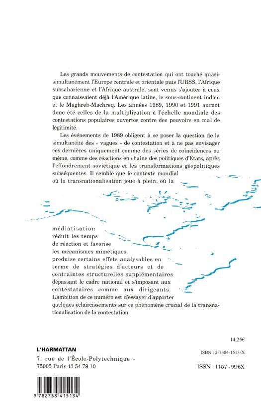 Les grands mouvements de contestation qui ont touché quasi simultanément l'Europe centrale et orientale puis I'URSS, I'Afrique subsaharienne et l'Afrique australe, sont venus s'ajouter à ceux que connaissaient déjà l'Amérique latine, le sous-continent indien et le Maghreb-Machreq. Les années 1989, 1990 et 1991 auront donc été celles de la multiplication à l'échelle mondiale des contestations populaires ouvertes contre des pouvoirs en mal de légitimité.