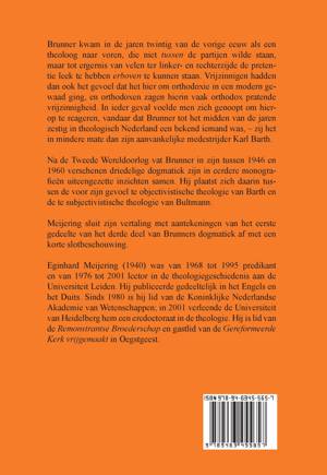 Brunner kwam in de jaren twintig van de vorige eeuw als een theoloog naar voren, die niet tussen de partijen wilde staan, maar tot ergernis van velen ter linker- en rechterzijde de preten-tie leek te hebben erboven te kunnen staan. Vrijzinnigen hadden dan ook het gevoel dat het hier om orthodoxie in een modern ge-waad ging, en orthodoxen zagen hierin vaak orthodox pratende vrijzinnigheid. In ieder geval voelde men zich genoopt om hier-op te reageren, vandaar dat Brunner tot het midden van de jaren zestig in theologisch Nederland een bekend iemand was, – zij het in mindere mate dan zijn aanvankelijke medestrijder Karl Barth. Na de Tweede Wereldoorlog vat Brunner in zijn tussen 1946 en 1960 verschenen driedelige dogmatiek zijn in eerdere monogra-fieën uiteengezette inzichten samen. Hij plaatst zich daarin tus-sen de voor zijn gevoel te objectivistische theologie van Barth en de te subjectivistische theologie van Bultmann. Meijering sluit zijn vertaling met aantekeningen van het eerste gedeelte van het derde deel van Brunners dogmatiek af met een korte slotbeschouwing.