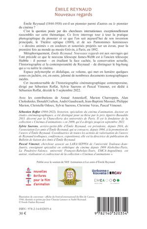 Émile Reynaud (1844-1918) est-il un pionnier parmi d'autres ou le pionnier du cinéma ? C'est la question posée par des chercheurs internationaux exceptionnellement rassemblés sur cette thématique. Ce livre interroge tour à tour la pratique photographique du pionnier et ce que l'on sait aujourd'hui de son invention principale, le Théâtre optique (1889), et de ses Pantomimes lumineuses - dessins animés en couleurs et sonorisés projetés sur un écran, pour la première fois au monde au musée Grévin, à Paris, en 1892. Métaphoriquement, Émile Reynaud. Nouveaux regards est aux ouvrages qui l'ont précédé ce que le nouveau télescope James-Webb est à l'ancien télescope Hubble: il permet - en étudiant la face cachée, la conservation actuelle, l'historiographie et la contemporanéité de Reynaud - de distinguer le big-bang qui a vu naître le cinéma. Espace polymorphe et dédalique, ce volume, qui met en lumière quelques zones en jachère, est, en outre, jalonné de nombreux documents iconographiques inédits. Cet incontournable de l'historiographie cinématographique contemporaine, dirigé par Sébastien Roffat, Sylvie Saerens et Pascal Vimenet, est dédié à Sébastien Roffat, décédé le 5 septembre 2022.
