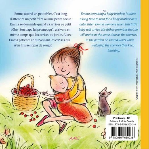 BILINGUE: Lorsque la famille s'agrandit, il peut être long d'attendre un petit frère ou une petite sœur. Emma se demande quand va arriver ce petit bébé. Son papa et sa maman lui promettent qu'il arrivera en même temps que les cerises au jardin. Alors Emma patiente en surveillant les cerises qui n'en finissent pas de rougir. Version bilingue français/anglais Découvrez, dans la Galerie, le portrait de Gitte Spee, l'illustratrice. EMMA ATTEND UN PETIT FRERE a été publié autrefois par Bayard presse jeunesse dans les Belles Histoires. L'histoire a rencontré un beau succès. Elle a été traduite, en anglais, en espagnol et en catalan. Nous sommes donc heureux de la republier, aujourd'hui, sous forme d'album en version BILINGUE FRANCAIS/ANGLAIS. Les petits lecteurs trouveront un fichier audio anglais, en accès libre, à l'intérieur de l'album. Il vous suffira pour cela de flasher le QR code offert . Le titre anglais est WAITING FOR A BABY BROTHER .