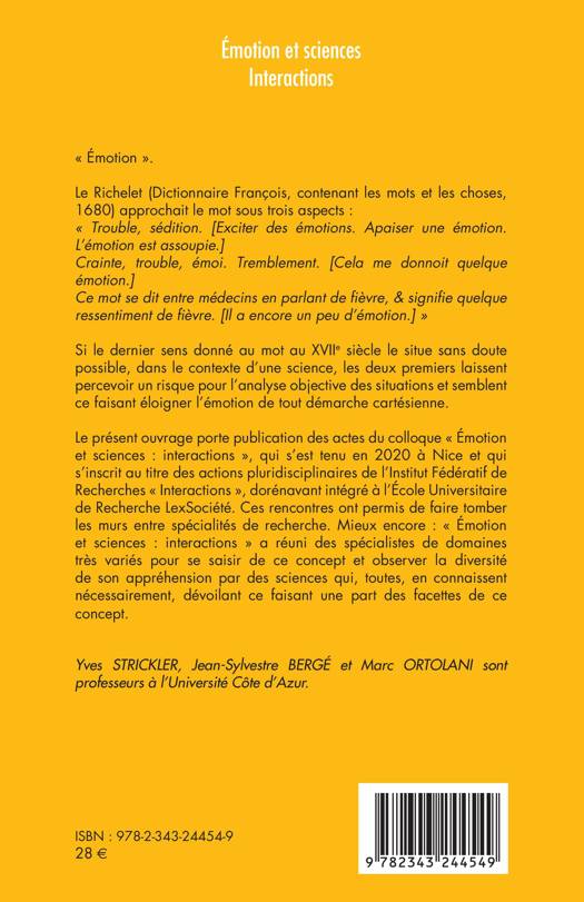 « Émotion ». Le Richelet (dictionnaire de 1680) définit le terme sous trois aspects : le trouble (exciter ou apaiser une émotion), la crainte ou l'émoi, et dans les termes de la médecine un signe de fièvre. Si le dernier sens du mot au XVIIe siècle le situe sans doute possible dans le contexte d'une science, les deux premiers laissent percevoir un risque pour l'analyse objective des situations, éloignant l'émotion de toute démarche cartésienne. Cet ouvrage présente une approche pluridisciplinaire pour saisir le concept d'émotion et observer la diversité de son appréhension par les sciences.