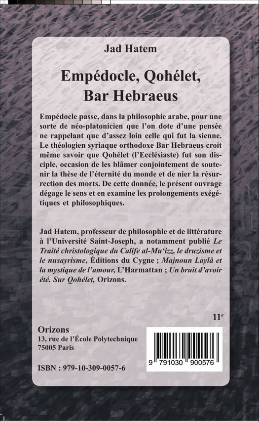 Empédocle passe, dans la philosophie arabe, pour une sorte de néo-platonicien que l'on dote d'une pensée ne rappelant que d'assez loin celle qui fut la sienne. Le théologien syriaque orthodoxe Bar Hebraeus allègue que Qohélet (l'Ecclésiaste) fut son disciple. De cette donnée, le présent ouvrage dégage le sens et en examine les prolongements exégétiques et philosophiques.