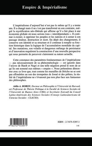 L'impérialisme d'aujourd'hui n'est pas le même qu'il y a trente ans. Il a changé mais il ne s'est pas transformé en son contraire, malgré la mystification néo-libérale qui affirme qu'il a fait place à une économie globale où nous serions tous " interdépendants". L'auteur avance qu'en dépit des changements, l'impérialisme conserve son identité et sa structure et il précise son désaccord avec l'oeuvre des philosophes Hardt et Negri, notamment à partir du livre "Empire".