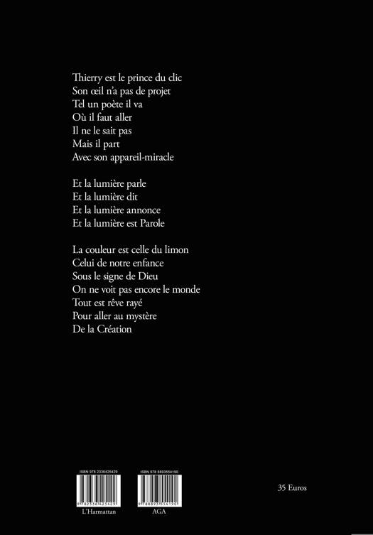 Les photographies de Thierry Delaballe sont un chant de liberté. Son temps est le film de son âme, délicate, intuitive, présentielle. Thierry Delaballe ne s’absente jamais du monde, malgré l’apparence qu’il donne. Il est in præsentia. Il possède un coffre de signes de l’univers. Ses archives photographiques sont un lieu de mystère. Il affirme toujours qu’il n’a pas de photos du sujet que je lui propose. Puis il se présente avec des chefs-d’œuvre, pris dans le temps sans temps. Le flux du temps n’est plus. C’est le flux de l’instant de son âme et de son corps qui se présente. Et les choses gardent alors l’énigme de la poésie. Étonnement. Extase. Identité. Rythme universel. Thierry Delaballe arrête le fugitif dans le minimal ancestral. Il a la certitude de l’essence. Son intuition imaginative est un éclair de la vision. La vitesse s’efface. Le temps est un invariant absolu, dans sa beauté. Giovanni Dotoli prouve que Thierry Delaballe est le prince du clic. Son œil n’a pas de projet. Tel un poète il va où il faut aller. Il ne le sait pas. Mais il part avec son appareil-miracle. Et la lumière parle. Et la lumière dit. Et la lumière annonce. Et la lumière est Parole. La couleur est celle du limon. Celui de notre enfance. Sous le signe de Dieu. On ne voit pas encore le monde. Tout est rêve rayé pour aller au mystère de la Création.
