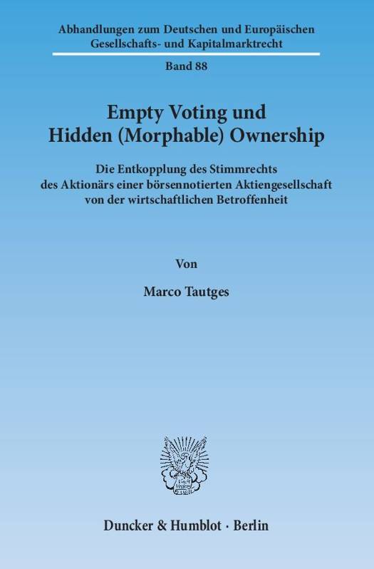 Der allgemein anerkannte Grundsatz, allein Aktionären als den Trägern der wirtschaftlichen Risiken das Stimmrecht zuzuweisen, ist jüngst durch findige Kapitalmarktteilnehmer aufgeweicht worden, die sich moderne Finanzinstrumente zunutze machen, um Stimmrecht und wirtschaftliches Risiko voneinander zu entkoppeln. Diese Entkopplung kann in den Spielarten des empty voting (Abstimmen ohne korrespondierendes wirtschaftliches Risiko) und der hidden (morphable) ownership (Tragung wirtschaftlicher Risiken ohne korrespondierendes Stimmrecht, v.a. zum Zwecke des Anschleichens an börsennotierte Gesellschaften) auftreten. Der Autor zeigt, dass das empty voting im Falle der neutralen oder negativen Ausgestaltung des Beteiligungsinteresses zwar verboten ist, hinsichtlich der Ausgestaltung des Beteiligungsinteresses allerdings Transparenzdefizite bestehen; er unterbreitet einen Vorschlag für eine neue Offenlegungsvorschrift. Die ein Anschleichen ermöglichenden Lücken des Rechts der Beteiligungstransparenz hingegen sind nach Ansicht des Autors zwischenzeitlich geschlossen worden.
