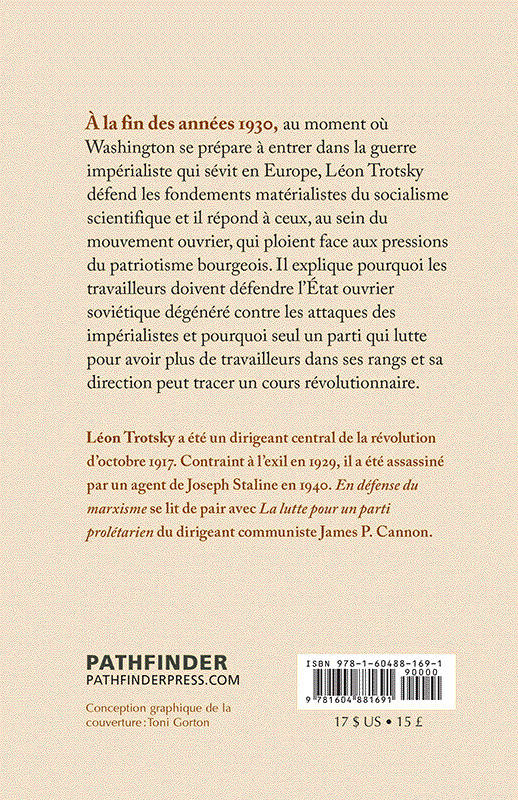À la fin des années 1930, au moment où Washington se prépare à entrer dans la guerre impérialiste qui sévit en Europe, Léon Trotsky défend les fondements matérialistes du socialisme scientifique et il répond à ceux, au sein du mouvement ouvrier, qui ploient face aux pressions du patriotisme bourgeois. Il explique pourquoi les travailleurs doivent défendre l'État ouvrier soviétique dégénéré contre les attaques des impérialistes et pourquoi seul un parti qui lutte pour avoir plus de travailleurs dans ses rangs et sa direction peut tracer un cours révolutionnaire.