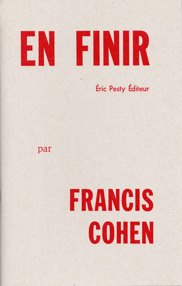 Par la présence implicite de Maurice Scève, En finir s’inscrit d’emblée dans la série des livres publiés par Francis Cohen au Théâtre Typographique. Le recueil produit dans son mouvement une entropie croissante, où chaque vers est un temps d’arrêt, où chaque enjambement est un risque et chaque page un franchissement, jusqu’à la prose finale qui semble défaire le programme même du titre.