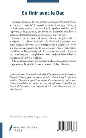 Le long épisode de la crise sanitaire a considérablement affecté les élèves et perturbé le déroulement de leurs apprentissages. Le fonctionnement et l'organisation du système scolaire, mis à l'épreuve de la pandémie, ont révélé des potentiels inutilisés et accentué des faiblesses déjà connues mais souvent tues. L'auteur tire les leçons de cette période exceptionnelle en analysant six thèmes révélateurs de dysfonctionnements mais aussi porteurs d'avenir. De l'enseignement à distance à l'école à la maison, en passant par le rôle des enseignants, l'orientation des élèves et l'organisation de l'Éducation nationale, il dresse un inventaire sans complaisance mais toujours bienveillant et soucieux de l'intérêt des élèves.Chemin faisant, il invite à refonder les bases du système scolaire et questionne la solidité de sa clé de voûte, le baccalauréat.
