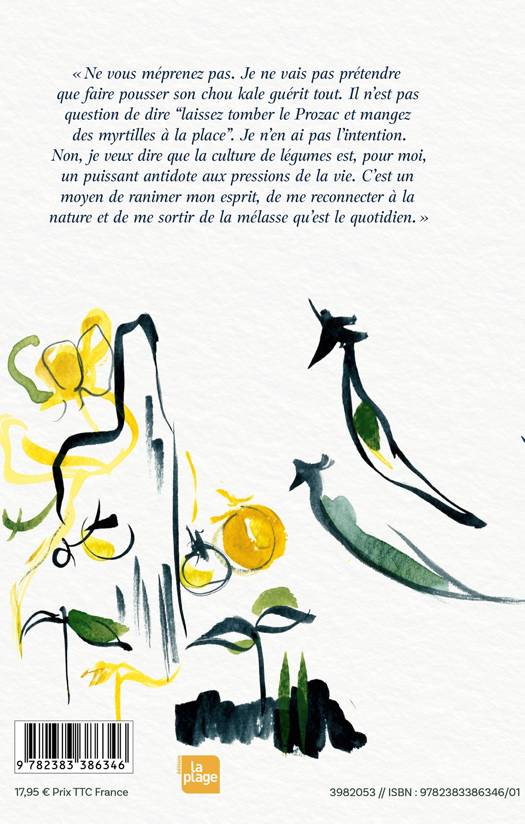 "Ne vous méprenez pas. Je ne vais pas prétendre que faire pousser son chou kale guérit tout. Il n'est pas question de dire "laissez tomber le Prozac et mangez des myrtilles à la place". Je n'en ai pas l'intention. Non, je veux dire que la culture de légumes est, pour moi, un puissant antidote aux pressions de la vie. C'est un moyen de ranimer mon esprit, de me reconnecter à la nature et de me sortir de la mélasse qu'est le quotidien.".