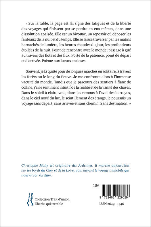 Christophe mahy nous dit cet "écoulement" : «Sur la table, la page est là, signe des fatigues et de la liberté des voyages qui finissent par se perdre en eux-mêmes, dans une dissolution apaisée. Elle est un bivouac, un reposoir où déposer les fardeaux de la nuit et du temps. Elle se laisse traverser par les matins harnachés de lumière, les heures chaudes du jour, les profondeurs étoilées de la nuit. Point de rencontre avec le monde, passage à gué au travers des flots et des flux. Porte de la patience, point de départ et d’arrivée. Poème aux lueurs encloses.