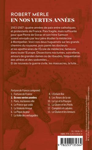1563-1567: quatre années de paix entre catholiques et protestants de France. Paix fragile, mais suffisante pour que Pierre de Siorac, héros de Fortune de France, et son frère Samson soient envoyés par leur père étudier la médecine à Montpellier. Voici nos deux frères huguenots sur les grands chemins du royaume, puis parmi les docteurs et apothicaires de l'Ecole de Médecine fameuse dans toute l'Europe. Dissections nocturnes, sorcellerie, amours de grandes dames ou de ribaudes, fréquentation des athées et des sodomites... Et puis de nouveau la guerre civile, les massacres, la fuite... Roman historique, roman picaresque, En nos vertes années nous fait traverser, au rythme de multiples aventures, une époque où la mort et l'horreur quotidiennes n'empèchent ni la soif de savoir ni cette « gaieté d'esprit » chère à Rabelais, où se marque l'immense vitalité de la Renaissance.