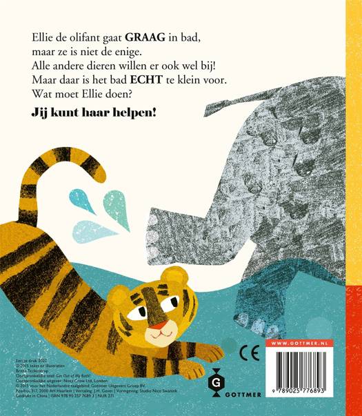 Ellie de olifant gaat graag in bad, maar ze is niet de enige! Als ze net lekker aan het spelen is, duiken er steeds meer dieren bij haar in bad: een krokodil, een flamingo, een muis en zelfs een tijger. Arme Ellie, nu heeft ze helemaal geen ruimte meer! Maar daar weet ze wel wat op. Die lange slurf heeft ze natuurlijk niet voor niks... Peuters en kleuters worden aangespoord om Ellie te helpen weer ruimte te maken door het boek te kantelen of te schudden, zodat het water over de bladzijden golft en klotst.