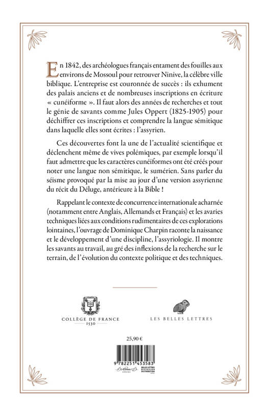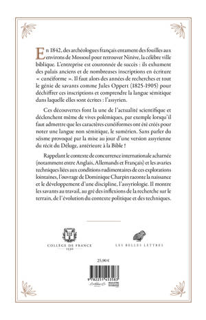 En 1842, des archeologues francais entament des fouilles aux environs de Mossoul pour retrouver Ninive, la celebre ville biblique. L'entreprise est couronnee de succes: ils exhument des palais anciens et de nombreuses inscriptions en ecriture cuneiforme . Il faut alors des annees de recherches et tout le genie de savants comme Jules Oppert (1825-1905) pour dechiffrer ces inscriptions et comprendre la langue semitique dans laquelle elles sont ecrites: l'assyrien. Ces decouvertes font la une de l'actualite scientifique et declenchent meme de vives polemiques, par exemple lorsqu'il faut admettre que les caracteres cuneiformes ont ete crees pour noter une langue non semitique, le sumerien. Sans parler du seisme provoque par la mise au jour d'une version assyrienne du recit du Deluge, anterieure a la Bible ! Rappelant le contexte de concurrence internationale acharnee (notamment entre Anglais, Allemands et Francais) et les avaries techniques liees aux conditions rudimentaires de ces explorations lointaines, l'ouvrage de Dominique Charpin raconte la naissance et le developpement d'une discipline, l'assyriologie. Il montre les savants au travail, au gre des inflexions de la recherche sur le terrain, de l'evolution du contexte politique et des techniques.